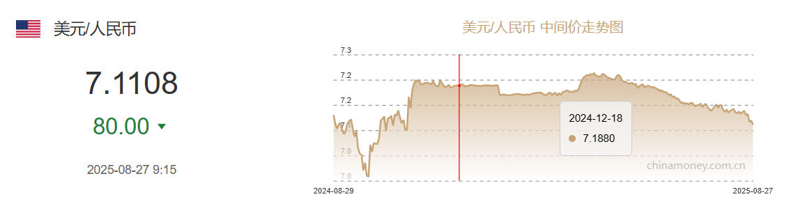 8月27日人民币对美元中间价报7.1108元 上调80个基点添加时间:2025-08-27 作者:傲旋 浏览:1192